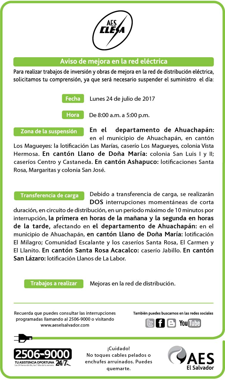 CLESA, lunes 24 de julio 22 julio, 2017 aeselsalvador Trabajos de mejora en la red de distribución electrica de CLESA: Comparte: Compartir en X (Se abre en una ventana nueva) X Comparte en Facebook (Se abre en una ventana nueva) Facebook Me gusta Cargando... CLESA, lunes 24 de julio
