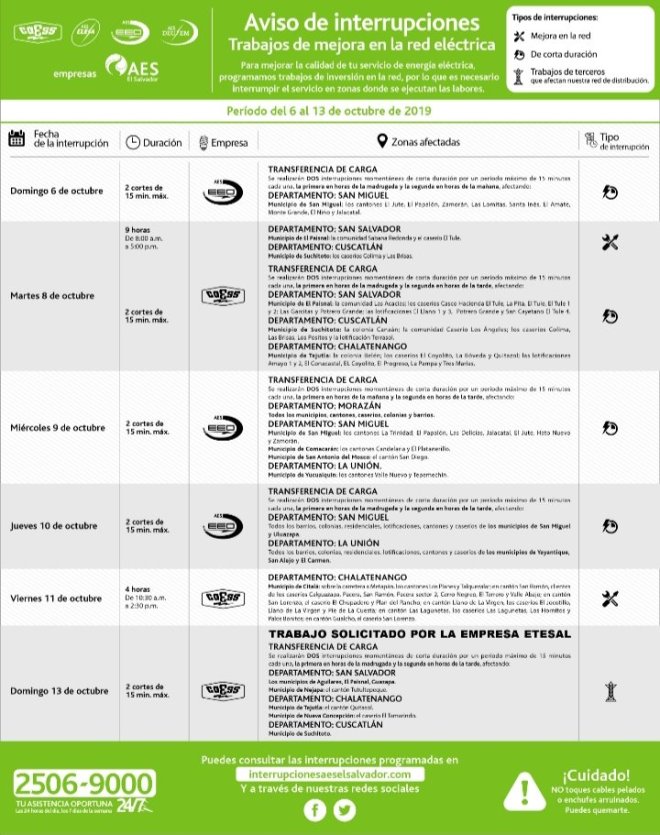 Interrupciones Programadas del 6 al 13 de octubre 3 octubre, 20193 octubre, 2019 aeselsalvador Comparte: Compartir en X (Se abre en una ventana nueva) X Comparte en Facebook (Se abre en una ventana nueva) Facebook Me gusta Cargando... Interrupciones Programadas del 6 al 13 de octubre