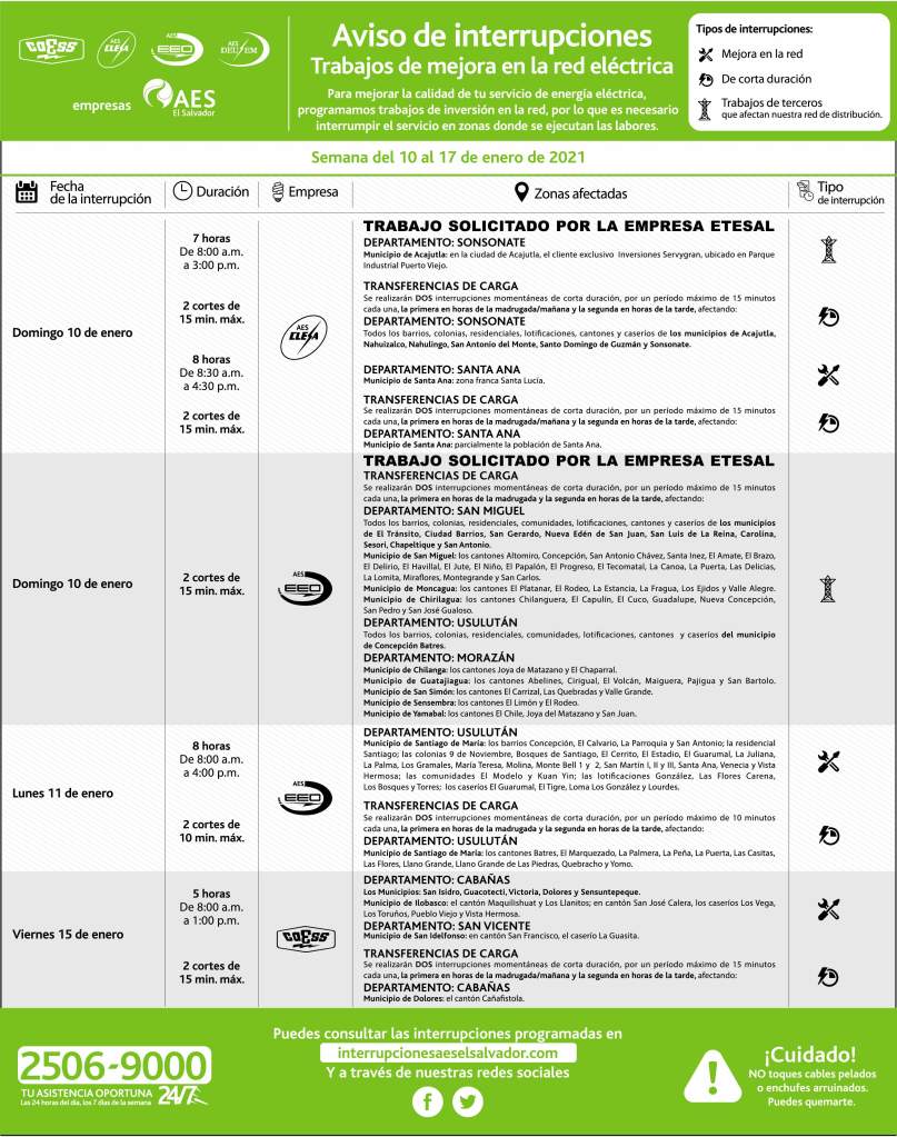 Interrupciones programadas del 10 al 17 de enero del 2021 8 enero, 2021 aeselsalvador Descargue Interrupciones AES del 10 al 17 de enero 2021Descarga Comparte: Compartir en X (Se abre en una ventana nueva) X Comparte en Facebook (Se abre en una ventana nueva) Facebook Me gusta Cargando... Interrupciones programadas del 10 al 17 de enero del 2021