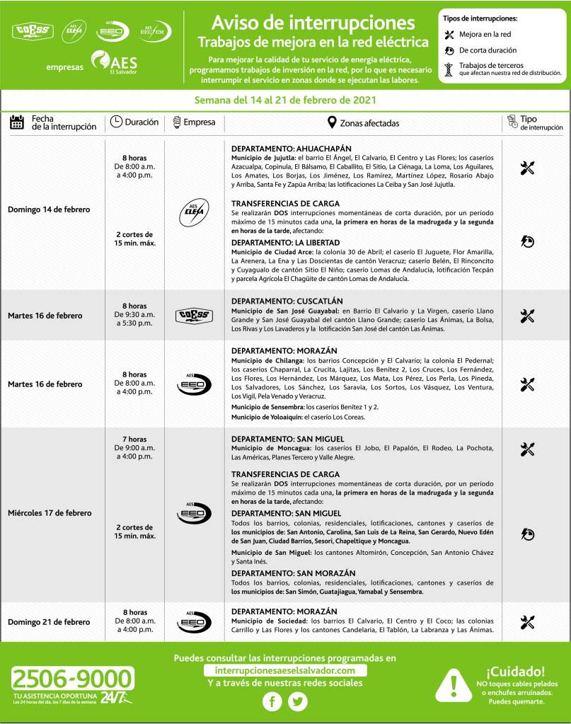 Interrupciones programadas del 14 al 21 de febrero 12 febrero, 202111 febrero, 2021 aeselsalvador descargue-interrupciones-programas-del-14-al-21-de-febreroDescarga Comparte: Compartir en X (Se abre en una ventana nueva) X Comparte en Facebook (Se abre en una ventana nueva) Facebook Me gusta Cargando... Interrupciones programadas del 14 al 21 de febrero