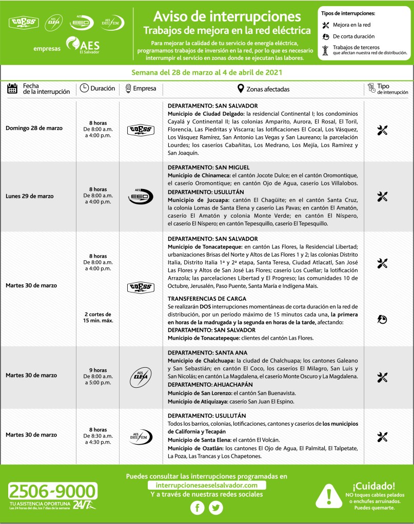 Interrupciones programadas del 28 de marzo al 4 de abril 26 marzo, 202125 marzo, 2021 aeselsalvador descargue-interrupciones-programadas-del-28-de-marzo-al-4-de-abrilDescarga Comparte: Compartir en X (Se abre en una ventana nueva) X Comparte en Facebook (Se abre en una ventana nueva) Facebook Me gusta Cargando... Interrupciones programadas del 28 de marzo al 4 de abril