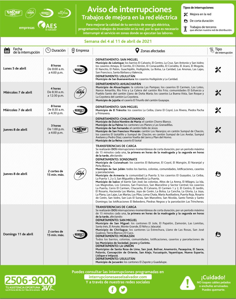 Interrupciones programadas del 4 al 11 de abril 2 abril, 20211 abril, 2021 aeselsalvador descargue-interrrupciones-programadas-del-4-al-11-de-abrilDescarga Comparte: Compartir en X (Se abre en una ventana nueva) X Comparte en Facebook (Se abre en una ventana nueva) Facebook Me gusta Cargando... Interrupciones programadas del 4 al 11 de abril