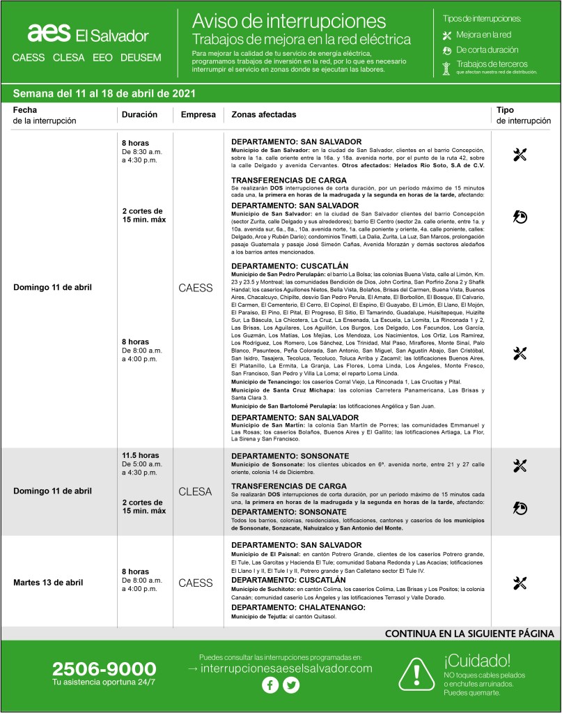Interrupciones programadas del 11 al 18 de abril 9 abril, 20219 abril, 2021 aeselsalvador Descargue-interrupciones-programadas-del-11-al-18-de-abril-1Descarga Comparte: Compartir en X (Se abre en una ventana nueva) X Comparte en Facebook (Se abre en una ventana nueva) Facebook Me gusta Cargando... Interrupciones programadas del 11 al 18 de abril