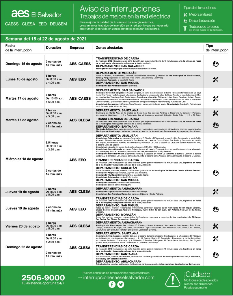 Interrupciones programadas del 15 al 22 de agosto 13 agosto, 2021 aeselsalvador descargue-interrupciones-programadas-del-15-al-22-de-agostoDescarga Comparte: Compartir en X (Se abre en una ventana nueva) X Comparte en Facebook (Se abre en una ventana nueva) Facebook Me gusta Cargando... Interrupciones programadas del 15 al 22 de agosto