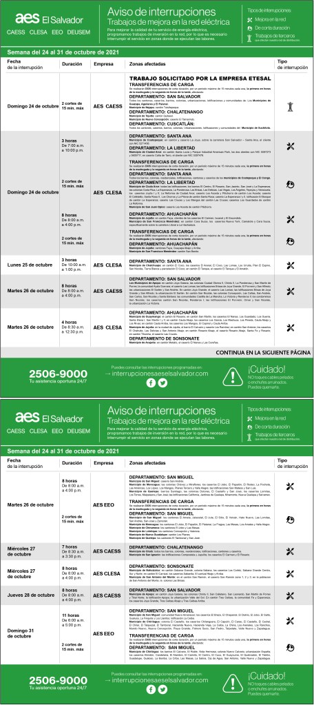 Interrupciones programadas del 24 al 31 de octubre 22 octubre, 202122 octubre, 2021 aeselsalvador descargue-interrupciones-del-24-al-31-de-octubreDescarga Comparte: Compartir en X (Se abre en una ventana nueva) X Comparte en Facebook (Se abre en una ventana nueva) Facebook Me gusta Cargando... Interrupciones programadas del 24 al 31 de octubre