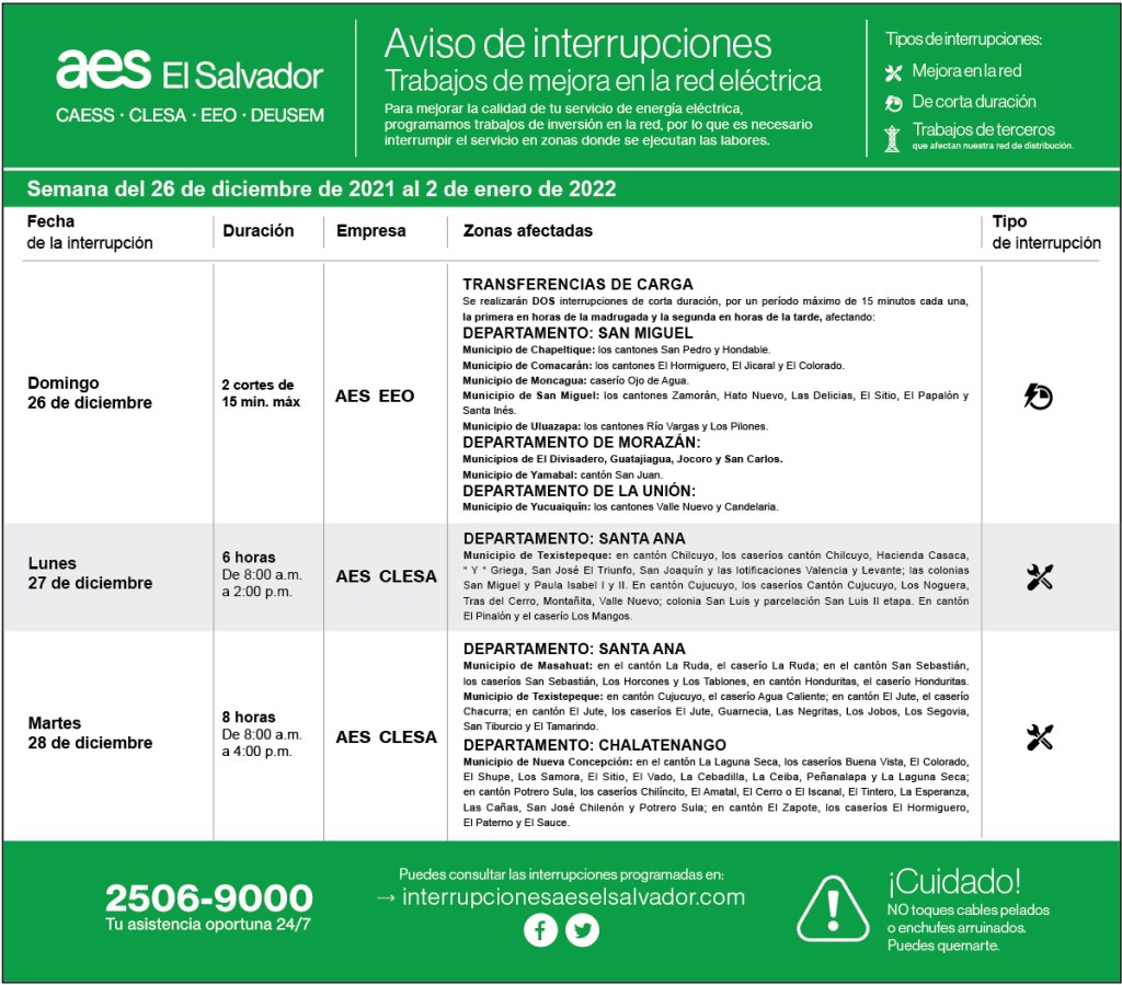 INTERRUPCIONES PROGRAMADAS DEL 26 DE DICIEMBRE 2021 AL 2 DE ENERO 2022. 24 diciembre, 202123 diciembre, 2021 aeselsalvadorCLESA, EEO descargue_interrupciones_programadas_del_26_diciembre_2021_al_2_enero_2022Descarga Comparte: Compartir en X (Se abre en una ventana nueva) X Comparte en Facebook (Se abre en una ventana nueva) Facebook Me gusta Cargando... INTERRUPCIONES PROGRAMADAS DEL 26 DE DICIEMBRE 2021 AL 2 DE ENERO 2022.