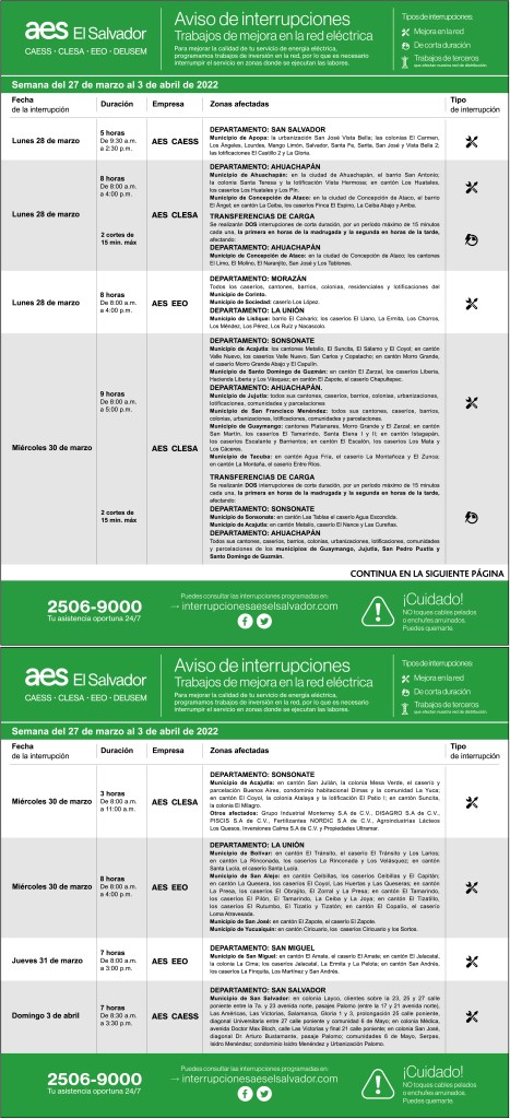 Interrupciones programadas del 27 de marzo al 3 de abril 25 marzo, 2022 aeselsalvador descargue-interrupciones-programadas-del-27-de-marzo-al-3-de-abrilDescarga Comparte: Compartir en X (Se abre en una ventana nueva) X Comparte en Facebook (Se abre en una ventana nueva) Facebook Me gusta Cargando... Interrupciones programadas del 27 de marzo al 3 de abril