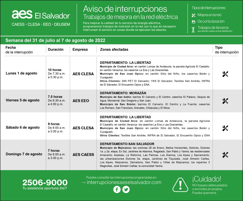 Interrupciones programadas del 31 de julio al 7 de agosto 29 julio, 202228 julio, 2022 aeselsalvadorCAESS, CLESA, EEO descargue-interrupciones-programadas-del-31-de-julio-al-7-de-agostoDescarga Comparte: Compartir en X (Se abre en una ventana nueva) X Comparte en Facebook (Se abre en una ventana nueva) Facebook Me gusta Cargando... Interrupciones programadas del 31 de julio al 7 de agosto