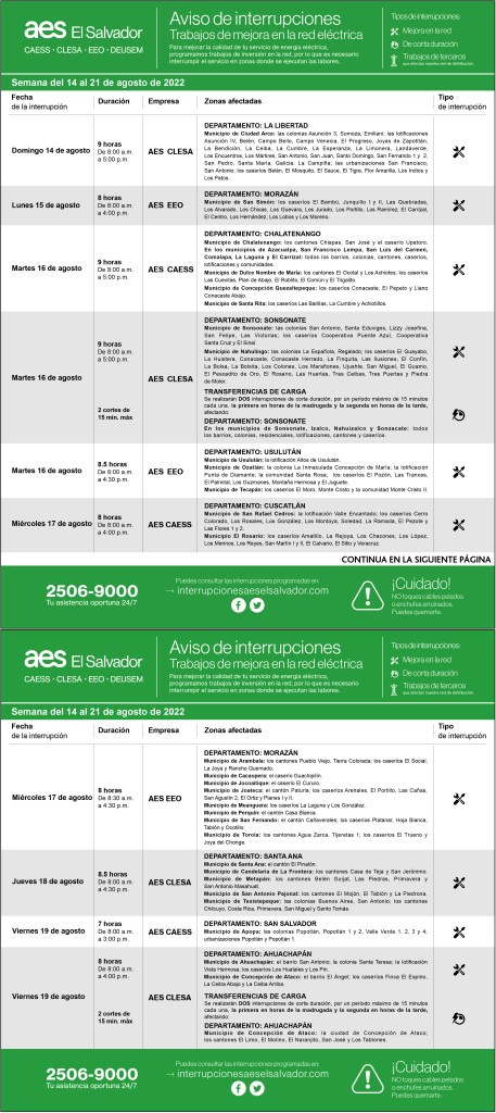 Interrupciones programadas del 14 al 21 de agosto 12 agosto, 202211 agosto, 2022 aeselsalvadorCAESS, CLESA, EEO descargue-interrupciones-programadas-del-14-al-21-de-agosto-de-2022Descarga Comparte: Compartir en X (Se abre en una ventana nueva) X Comparte en Facebook (Se abre en una ventana nueva) Facebook Me gusta Cargando... Interrupciones programadas del 14 al 21 de agosto
