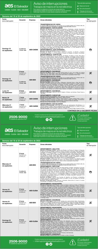 Interrupciones programadas del 18 al 25 de septiembre 16 septiembre, 202214 septiembre, 2022 aeselsalvadorCAESS, CLESA, EEO descargue-interrupciones-programadas-del-18-al-25-de-septiembreDescarga Comparte: Compartir en X (Se abre en una ventana nueva) X Comparte en Facebook (Se abre en una ventana nueva) Facebook Me gusta Cargando... Interrupciones programadas del 18 al 25 de septiembre
