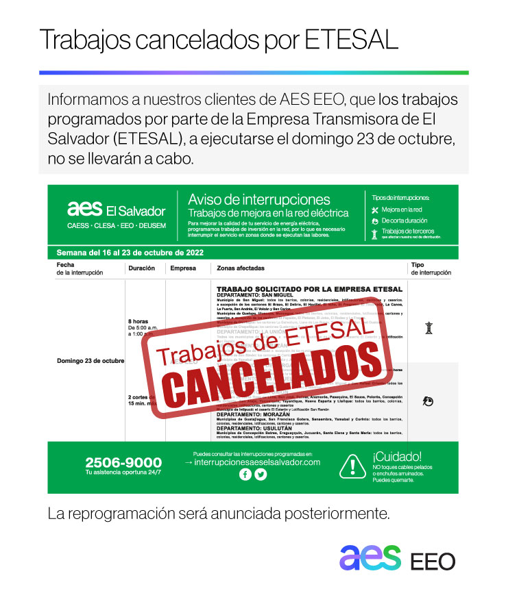 Trabajos cancelados por la empresa ETESAL, domingo 23 de octubre 21 octubre, 2022 aeselsalvadorEEO Comparte: Compartir en X (Se abre en una ventana nueva) X Comparte en Facebook (Se abre en una ventana nueva) Facebook Me gusta Cargando... Imagen