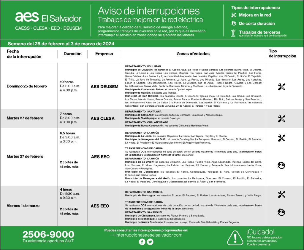 Interrupciones programadas del 25 de febrero al 3 de marzo 23 febrero, 202422 febrero, 2024 aeselsalvadorCAESS, CLESA, DEUSEM, EEO descargue_interrupciones_programadas_del_25_de_febrero_al_3_de_marzoDescarga Comparte: Haz clic para compartir en X (Se abre en una ventana nueva) X Haz clic para compartir en Facebook (Se abre en una ventana nueva) Facebook Me gusta Cargando... Interrupciones programadas del 25 de febrero al 3 de marzo