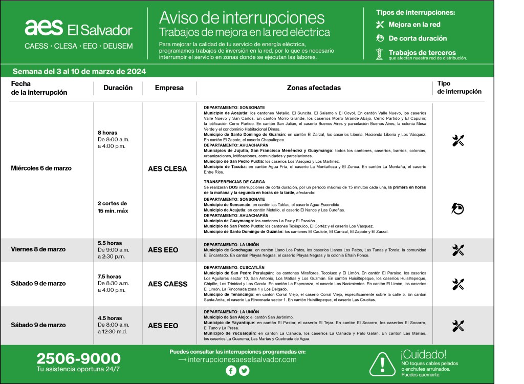 Interrupciones programadas del 3 de marzo al 10 de marzo 1 marzo, 202429 febrero, 2024 aeselsalvadorCAESS, CLESA, DEUSEM, EEO descargue_interrupciones_programadas_del_3_de_marzo_al_10_de_marzoDescarga Comparte: Haz clic para compartir en X (Se abre en una ventana nueva) X Haz clic para compartir en Facebook (Se abre en una ventana nueva) Facebook Me gusta Cargando... Interrupciones programadas del 3 de marzo al 10 de marzo