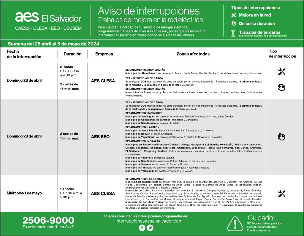 Interrupciones programas del 28 de abril al 5 de mayo 26 abril, 202425 abril, 2024 aeselsalvadorCLESA, EEO descargue_interrupciones_programadas_del_28_de_abril_al_5_de_mayoDescarga Comparte: Haz clic para compartir en X (Se abre en una ventana nueva) X Haz clic para compartir en Facebook (Se abre en una ventana nueva) Facebook Me gusta Cargando... Interrupciones programas del 28 de abril al 5 de mayo