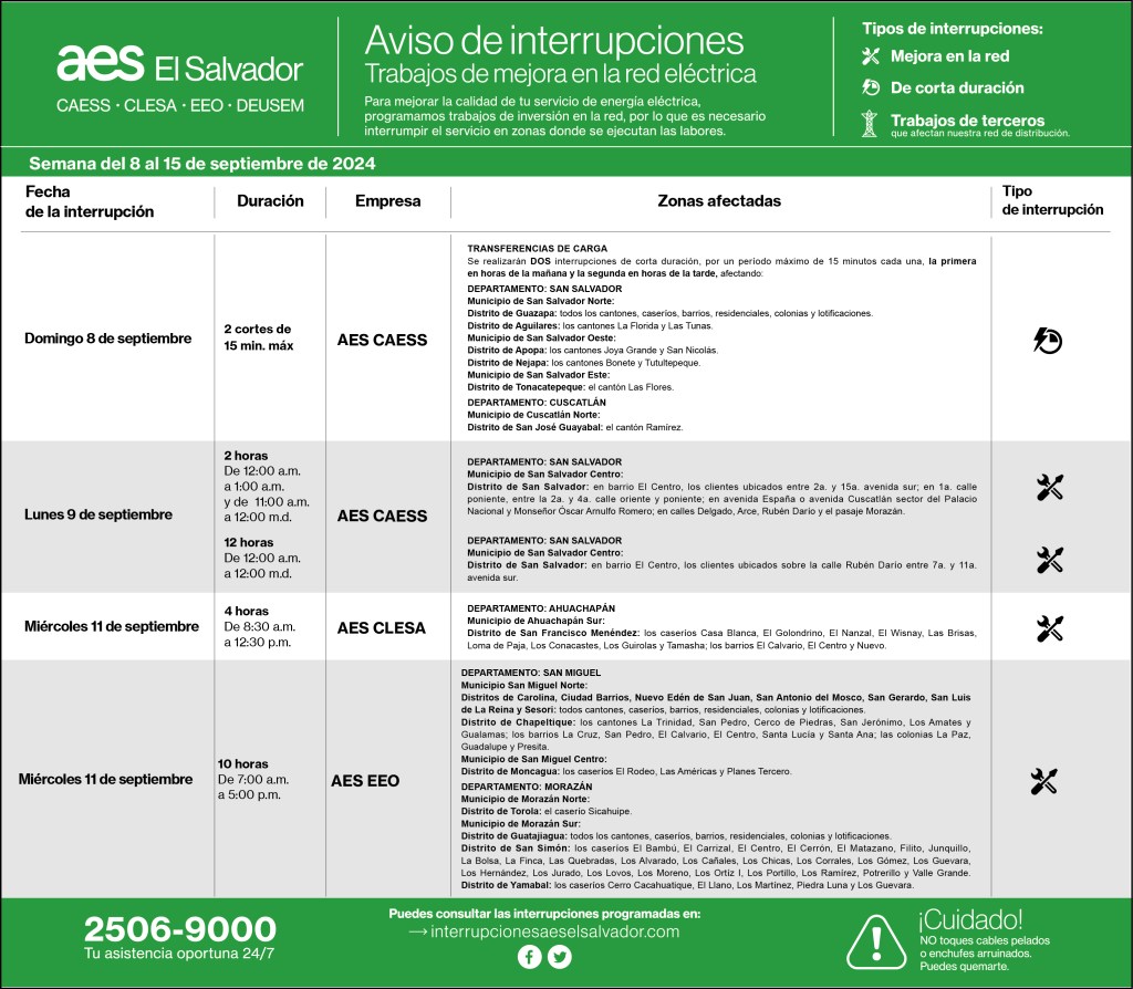 Interrupciones programadas del 8 al 15 de septiembre 6 septiembre, 20245 septiembre, 2024 aeselsalvador descargue_interrupciones_programadas_del_8_al_15_de_septiembreDescarga Comparte: Haz clic para compartir en X (Se abre en una ventana nueva) X Haz clic para compartir en Facebook (Se abre en una ventana nueva) Facebook Me gusta Cargando... Interrupciones programadas del 8 al 15 de septiembre