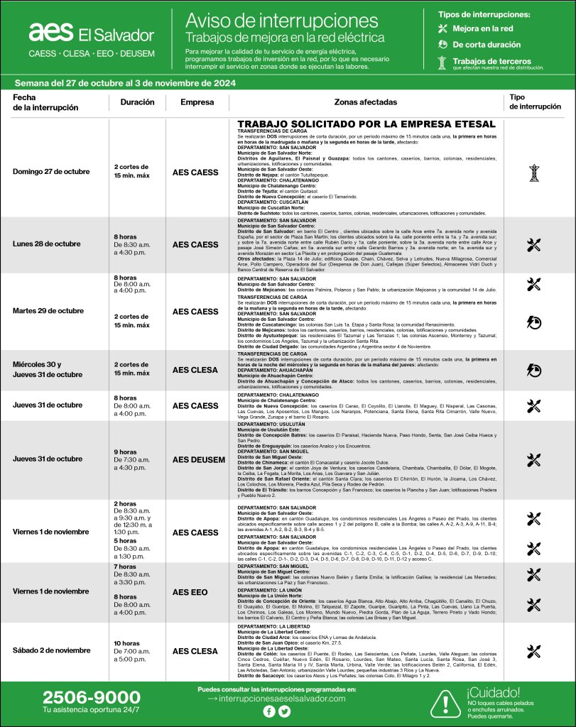 Interrupciones programadas del 27 de octubre al 3 de noviembre 25 octubre, 202424 octubre, 2024 aeselsalvadorCAESS, CLESA, DEUSEM, EEO descargue_interrupciones_programadas_del_27_de_octubre_al_3_de_noviembreDescarga Comparte: Haz clic para compartir en X (Se abre en una ventana nueva) X Haz clic para compartir en Facebook (Se abre en una ventana nueva) Facebook Me gusta Cargando... Interrupciones programadas del 27 de octubre al 3 de noviembre