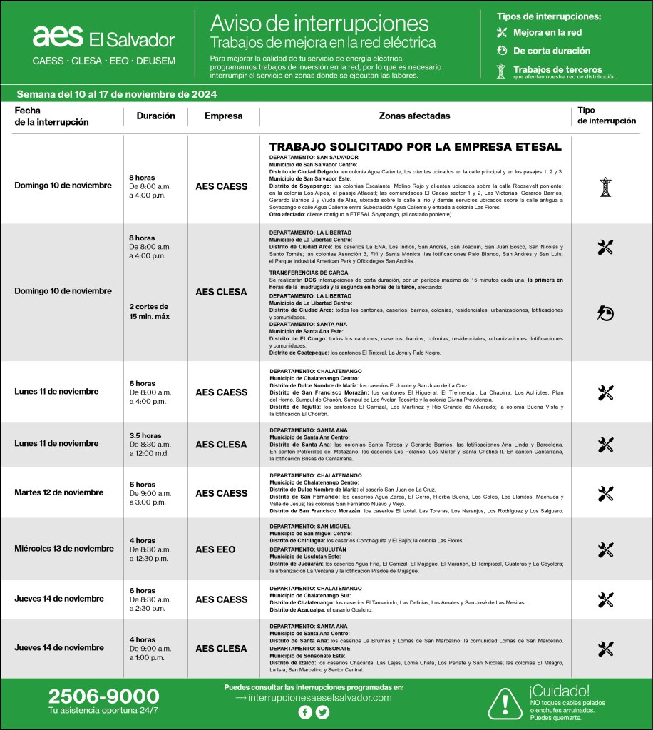 Interrupciones programadas del 10 al 17 de noviembre 8 noviembre, 20247 noviembre, 2024 aeselsalvadorCAESS, CLESA, DEUSEM, EEO descargue_interrupciones_programadas_del 10_al_17_de_noviembreDescarga Comparte: Haz clic para compartir en X (Se abre en una ventana nueva) X Haz clic para compartir en Facebook (Se abre en una ventana nueva) Facebook Me gusta Cargando... Interrupciones programadas del 10 al 17 de noviembre