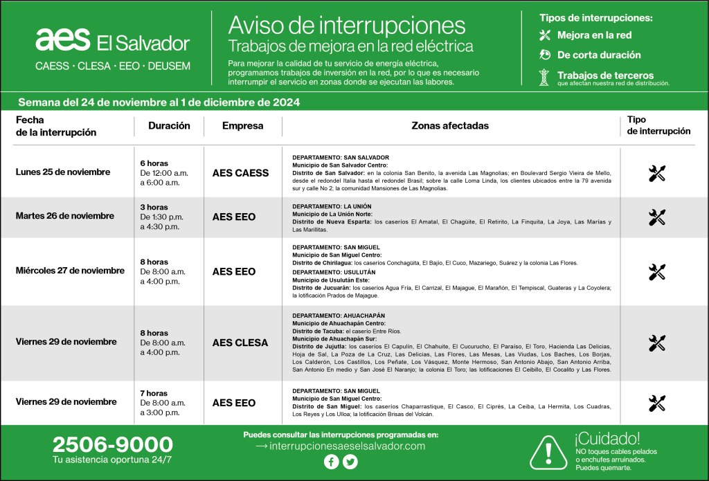 Interrupciones programadas del 24 de noviembre al 1 de diciembre 22 noviembre, 202421 noviembre, 2024 aeselsalvadorCAESS, CLESA, DEUSEM, EEO descargue_interrupciones_programadas_del 24_de_noviembre_al_1_de_diciembreDescarga Comparte: Haz clic para compartir en X (Se abre en una ventana nueva) X Haz clic para compartir en Facebook (Se abre en una ventana nueva) Facebook Me gusta Cargando... Interrupciones programadas del 24 de noviembre al 1 de diciembre