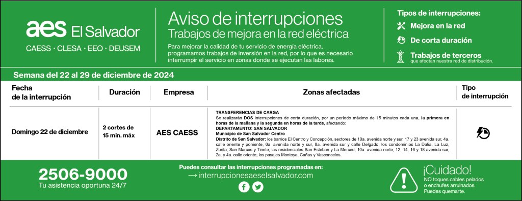 Interrupciones programadas del 22 al 29 de diciembre 20 diciembre, 202419 diciembre, 2024 aeselsalvadorCAESS descargue_interrupciones_programadas_del 22_al_29_de_diciembreDescarga Comparte: Haz clic para compartir en X (Se abre en una ventana nueva) X Haz clic para compartir en Facebook (Se abre en una ventana nueva) Facebook Me gusta Cargando... Interrupciones programadas del 22 al 29 de diciembre