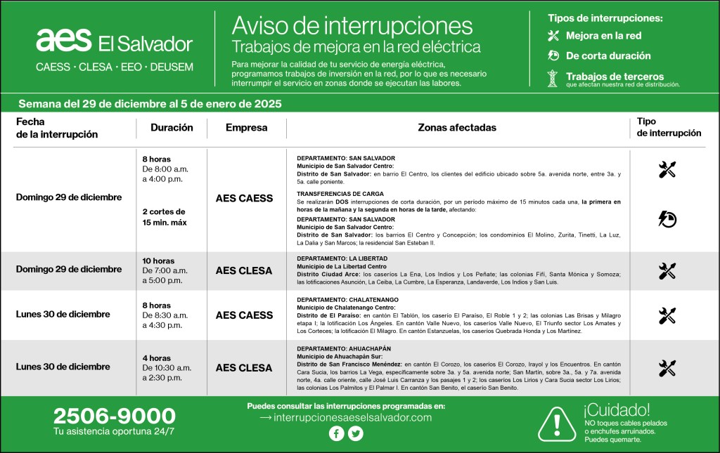 Interrupciones programadas del 29 de diciembre al 5 de enero 27 diciembre, 202426 diciembre, 2024 aeselsalvadorCAESS, CLESA, DEUSEM, EEO descargue_interrupciones_programadas_del_29_de_diciembre_al_5_de_eneroDescarga Comparte: Haz clic para compartir en X (Se abre en una ventana nueva) X Haz clic para compartir en Facebook (Se abre en una ventana nueva) Facebook Me gusta Cargando... Interrupciones programadas del 29 de diciembre al 5 de enero