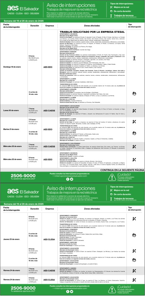 Interrupciones programadas del 19 al 26 de enero 17 enero, 202516 enero, 2025 aeselsalvadorCAESS, CLESA, DEUSEM, EEO descargue_interrupciones_programadas_del_19_al_26_de_eneroDescarga Comparte: Haz clic para compartir en X (Se abre en una ventana nueva) X Haz clic para compartir en Facebook (Se abre en una ventana nueva) Facebook Me gusta Cargando... Interrupciones programadas del 19 al 26 de enero