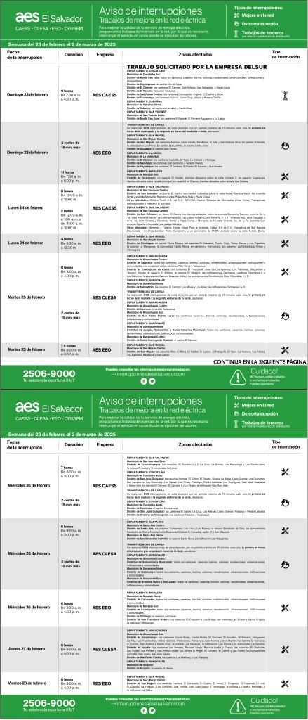 Interrupciones programadas del 23 de febrero al 2 de marzo 21 febrero, 202521 febrero, 2025 aeselsalvadorCAESS, CLESA, DEUSEM, EEO descargue_interrupciones_programadas_del 23_de_febrero_al_2_de_marzoDescarga Comparte: Haz clic para compartir en X (Se abre en una ventana nueva) X Haz clic para compartir en Facebook (Se abre en una ventana nueva) Facebook Me gusta Cargando... Interrupciones programadas del 23 de febrero al 2 de marzo