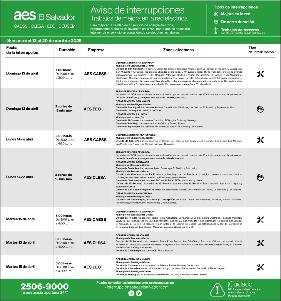 Interrupciones programadas del 13 al 20 de abril 11 abril, 202510 abril, 2025 aeselsalvadorCAESS, CLESA, DEUSEM, EEO descargue_interrupciones_programadas_del_13_al_20_de_abrilDescarga Comparte: Haz clic para compartir en X (Se abre en una ventana nueva) X Haz clic para compartir en Facebook (Se abre en una ventana nueva) Facebook Me gusta Cargando... Interrupciones programadas del 13 al 20 de abril