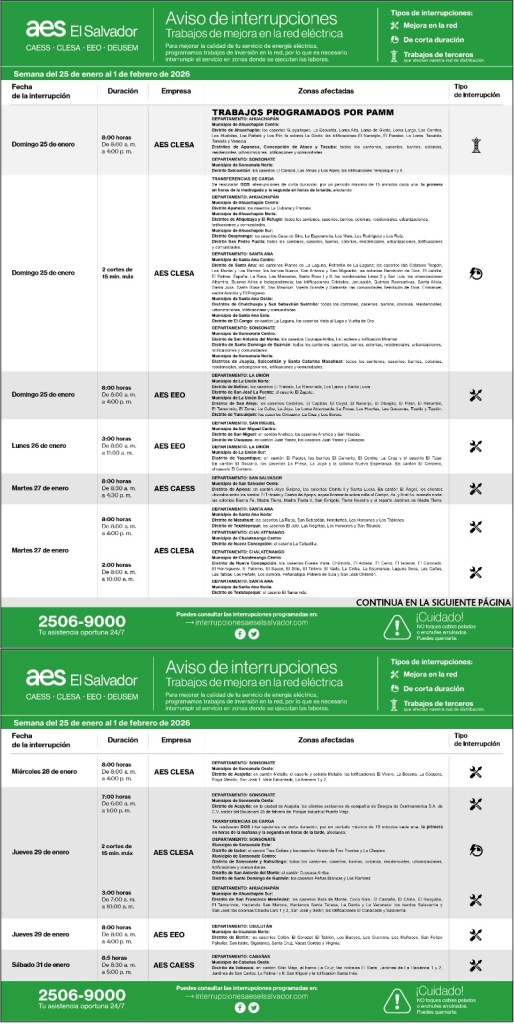 Interrupciones programadas del 25 de enero al 1 de febrero 23 enero, 202622 enero, 2026 aeselsalvadorCAESS, CLESA, DEUSEM, EEO descargue_interrupciones_programadas_del_25_de_enero_al_1_de_febreroDownload Comparte: Compartir en X (Se abre en una ventana nueva) X Comparte en Facebook (Se abre en una ventana nueva) Facebook Me gusta Cargando... Interrupciones programadas del 25 de enero al 1 de febrero