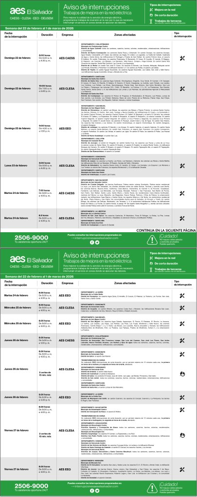 Interrupciones programadas del 22 de febrero al 1 de marzo 20 febrero, 202619 febrero, 2026 aeselsalvadorCAESS, CLESA, DEUSEM, EEO descargue_interrupciones_programadas_del_22_de_febrero_al_1_de_marzoDescarga Comparte: Compartir en X (Se abre en una ventana nueva) X Comparte en Facebook (Se abre en una ventana nueva) Facebook Me gusta Cargando... Interrupciones programadas del 22 de febrero al 1 de marzo