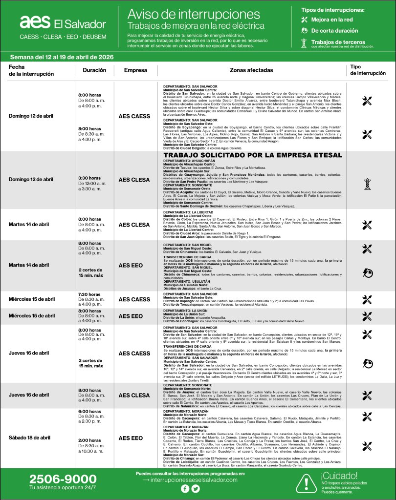 Interrupciones programadas del 12 al 19 de abril 10 abril, 20269 abril, 2026 aeselsalvadorCAESS, CLESA, DEUSEM, EEO descargue_interrupciones_programadas_del 12_al_19_de_abrilDescarga Comparte: Compartir en X (Se abre en una ventana nueva) X Comparte en Facebook (Se abre en una ventana nueva) Facebook Me gusta Cargando... Interrupciones programadas del 12 al 19 de abril