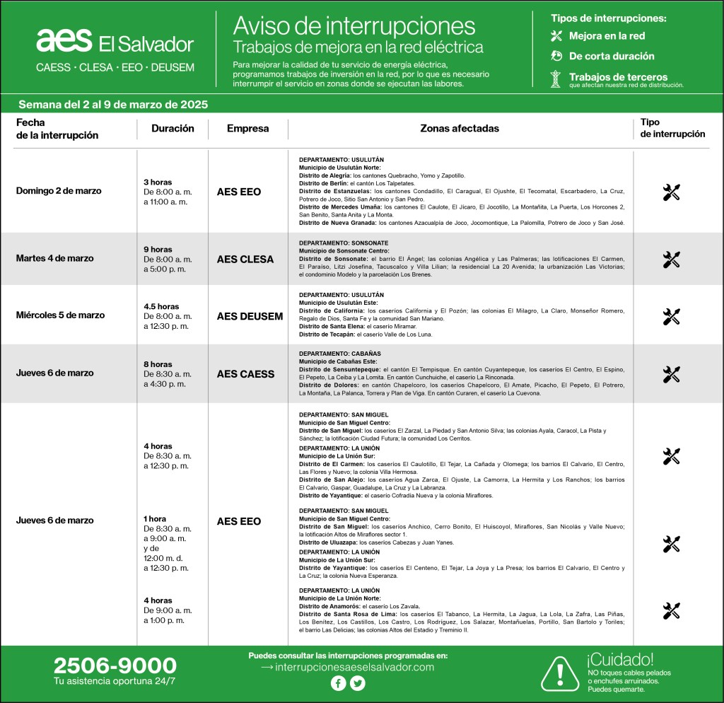 Municipio de San Salvador Centro en distrito de San Salvador: en colonia Escalón, los clientes ubicados en 13a. calle poniente entre Pasaje Sagrado Corazón y 89 avenida Norte; en 15a. calle poniente clientes entre el pasaje Sagrado Corazón y 91 avenida Norte; clientes en 85 avenida Norte, entre calle El Mirador y Pasaje Arrué; en Residencial Alturas de la Escalón, la calle principal entre calle Columbia y 85 avenida Norte; en comunidad Valle del Oro, la calle principal y los pasajes 2,3,4 y 6.