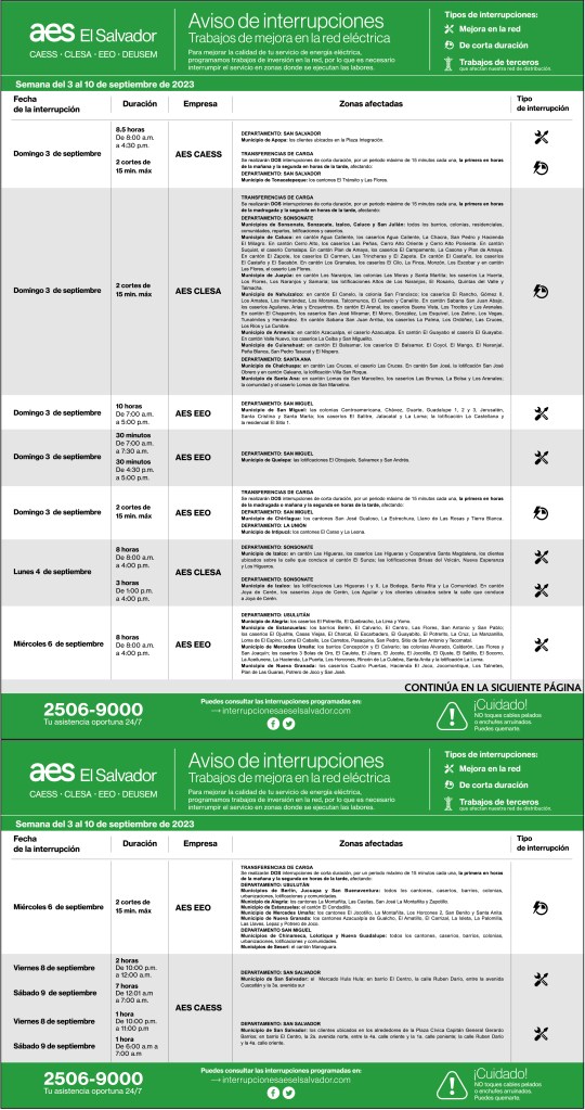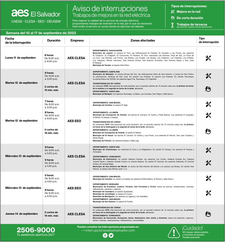 Interrupciones programadas del 10 al 17 de septiembre