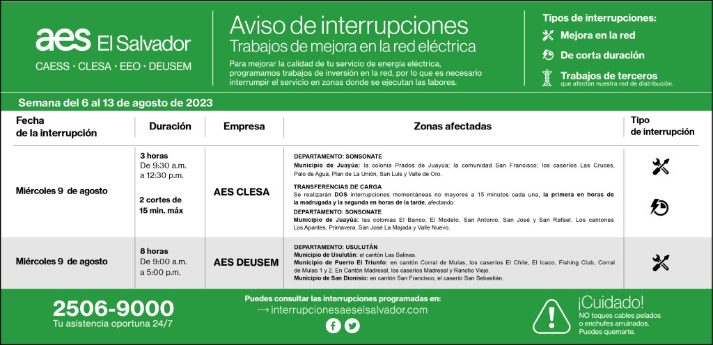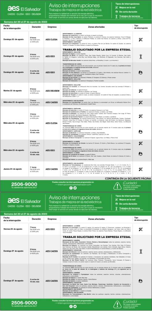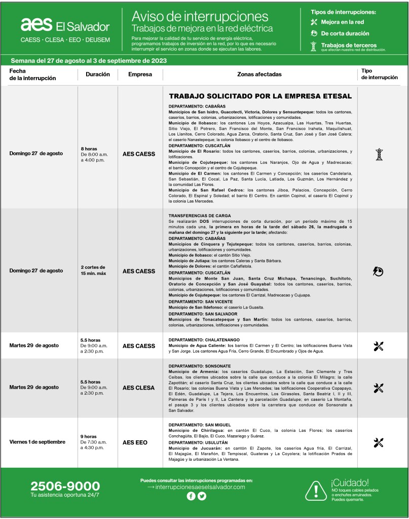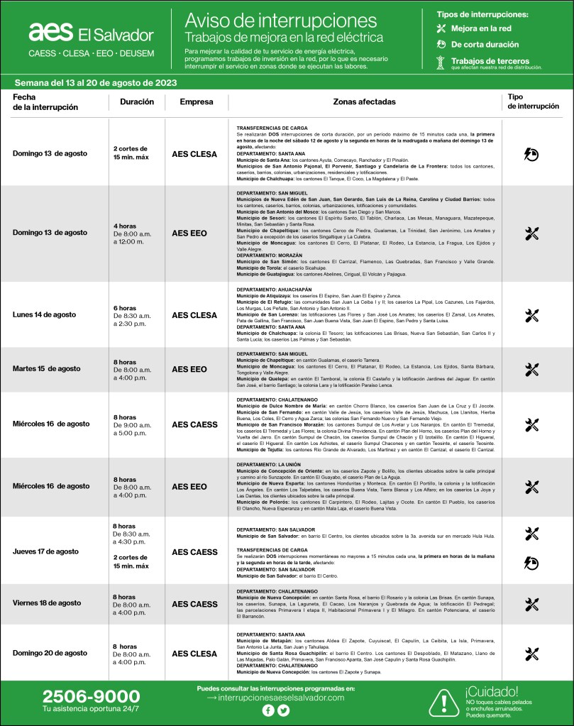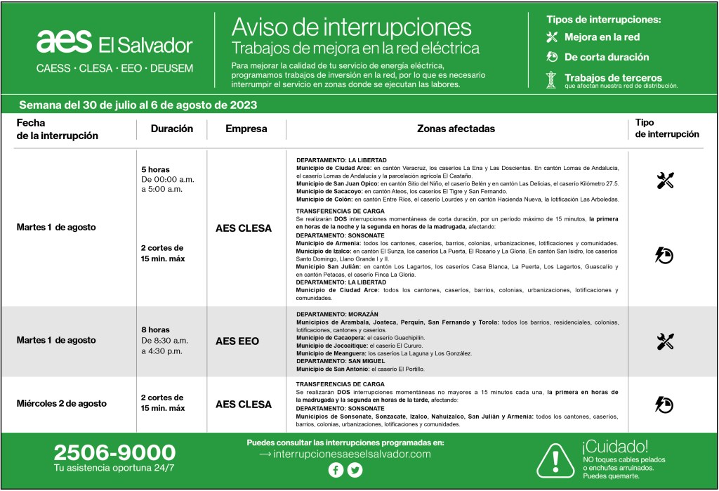 Interrupciones programadas del 30 de julio al 6 de agosto