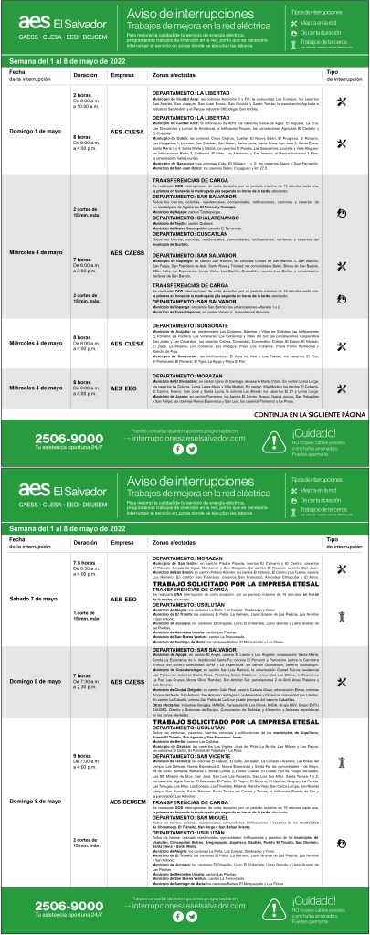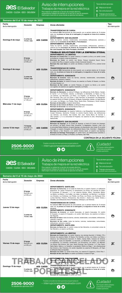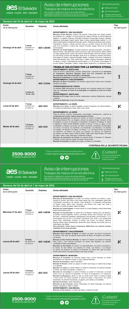 Interrupciones programadas del 24 de abril al 1 de mayo