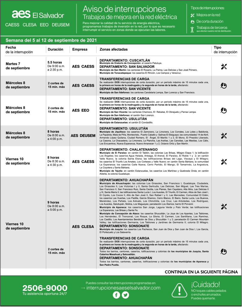 Municipio de Usulutan: en las colonias San Juan Bosco 2 y El Porvenir; en los caseríos La Presa, Las Azucenas, Puente Negro