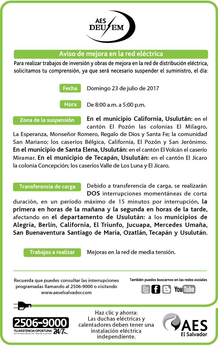 Debido a transferencia de carga, el servicio de energía eléctrica se verá momentáneamente interrumpido, en los siguientes municipios del departamento de Usulután: