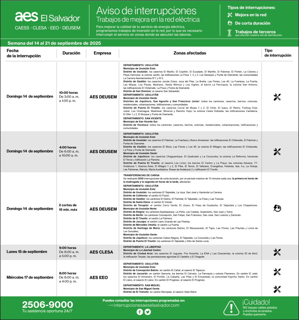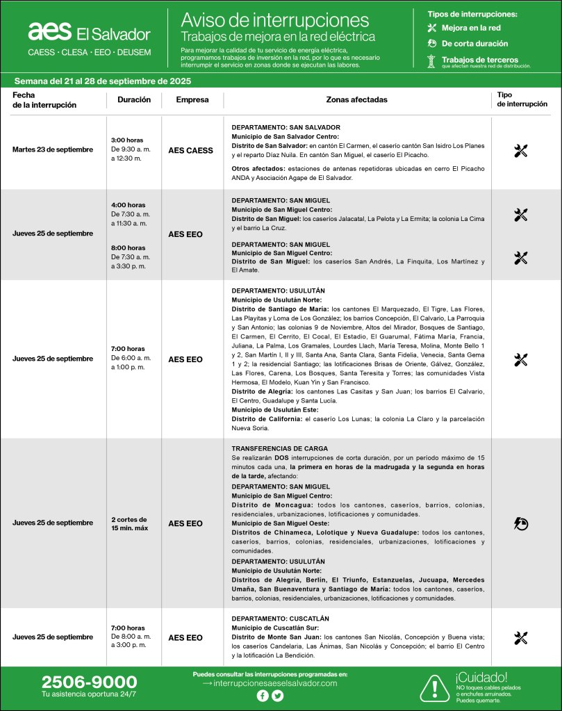 Interrupciones programadas del 21 al 28 de septiembre