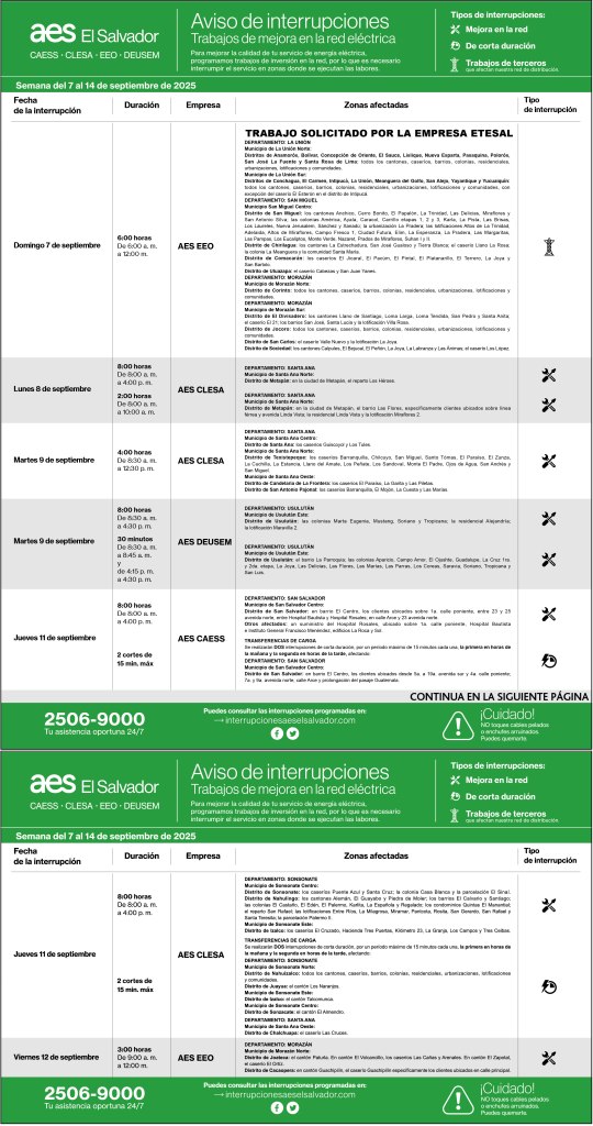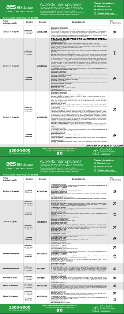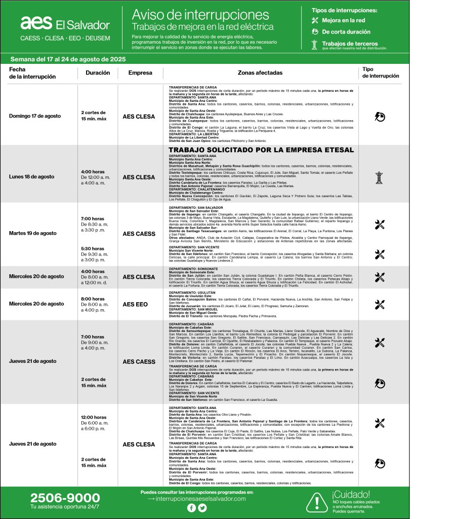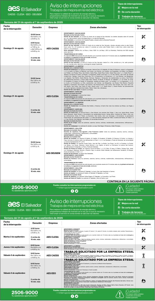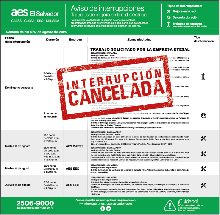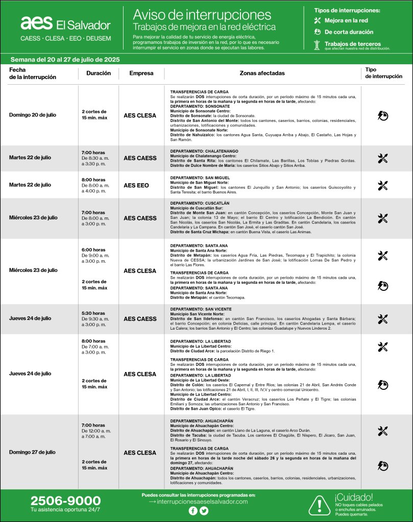 Interrupciones programadas del 27 de julio al 3 de agosto