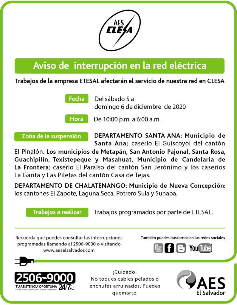 Trabajos cancelados por la empresa ETESAL, domingo 23 de octubre 21 octubre, 2022 aeselsalvadorEEO Imagen